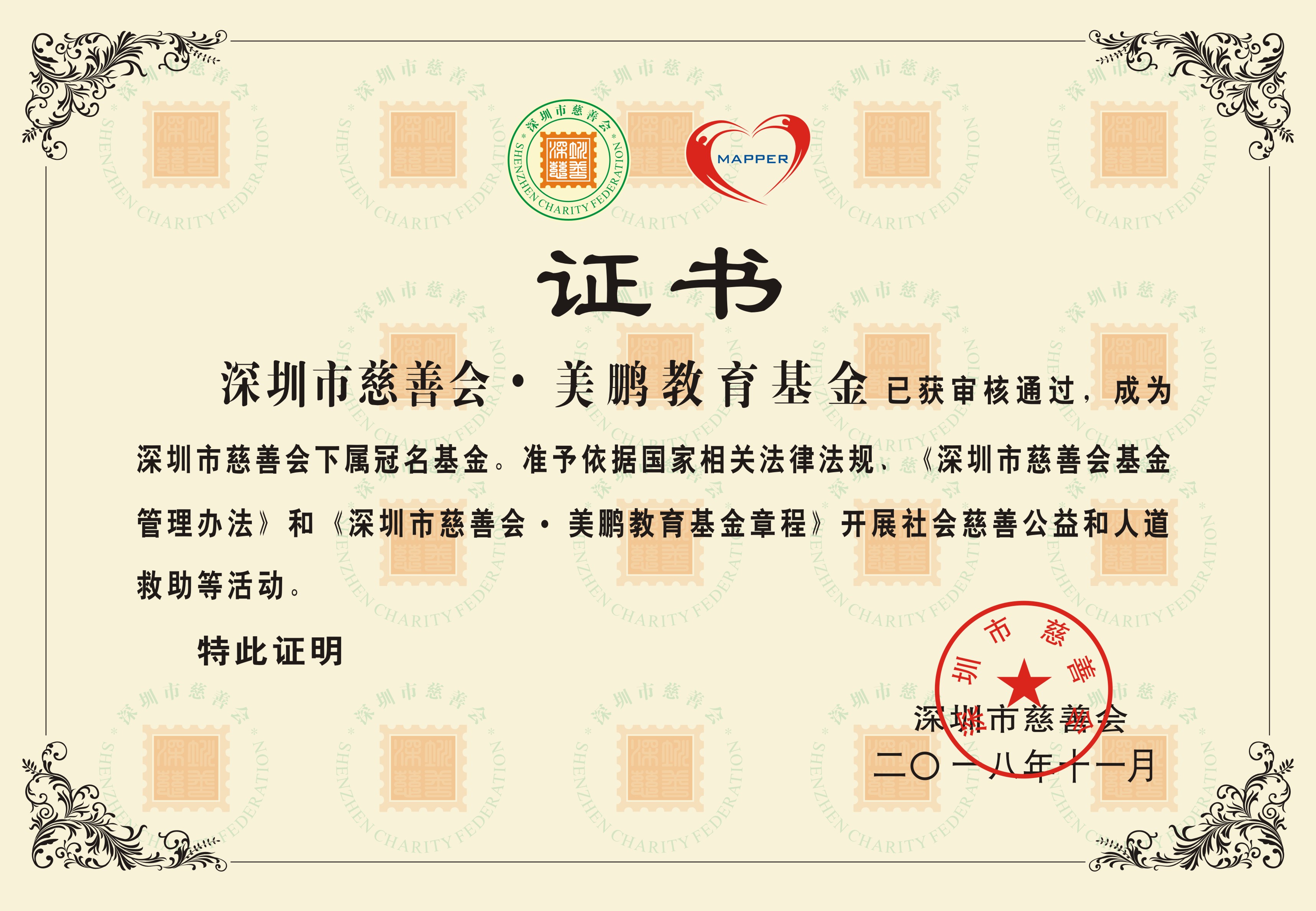 2018年12月6日,美鹏教育基金会会长杨莉受邀参加深圳市慈善会的基金授牌仪式,现场接受慈善会颁发的授权证书,这意味着深圳市慈善会 · 美鹏教育基金正式成立。
