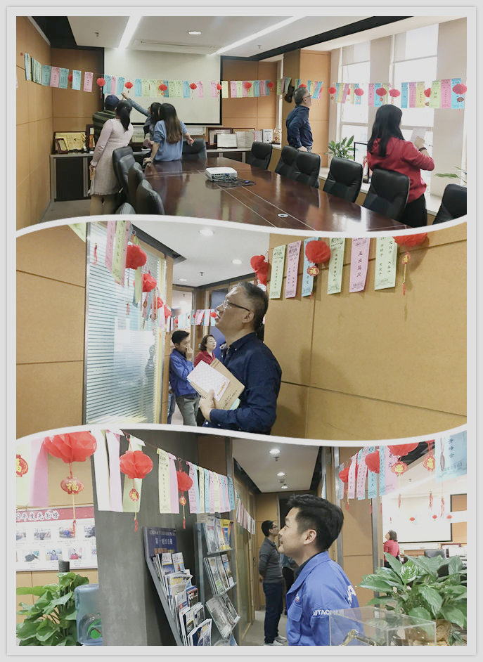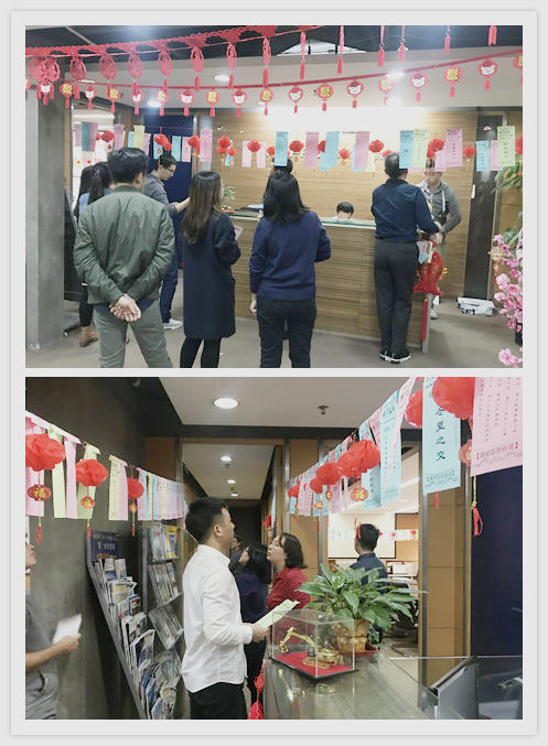 总公司前台、会议室、办公室走廊等挂满了喜气洋洋的红灯笼以及400道彩色灯谜条。来自美鹏的高手们争相竞技,猜谜博弈,现场不时传来阵阵笑语。